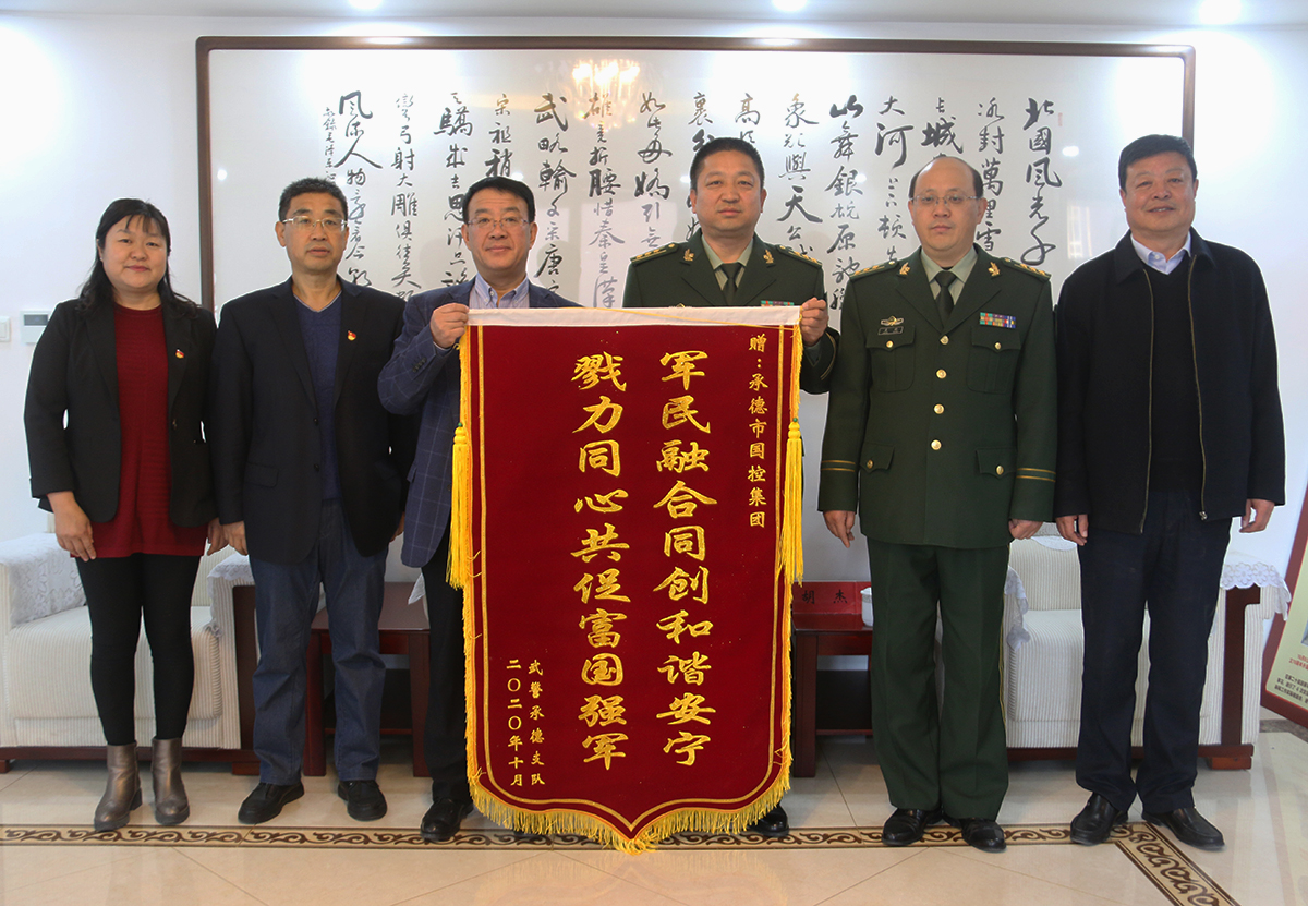 11月5日上午,武警承德支队支队长马效国、政委姜顺将“军民融合同创和谐安宁,勠力同心共促富国强军”的锦旗送到集团公司,感谢集团公司对武警承德支队的关心与支持。集团公司党委书记、董事长张建军,总经理徐俊儒,监事会主席唐春民,智能停车场公司执行董事胡杰等同志参加会见。
