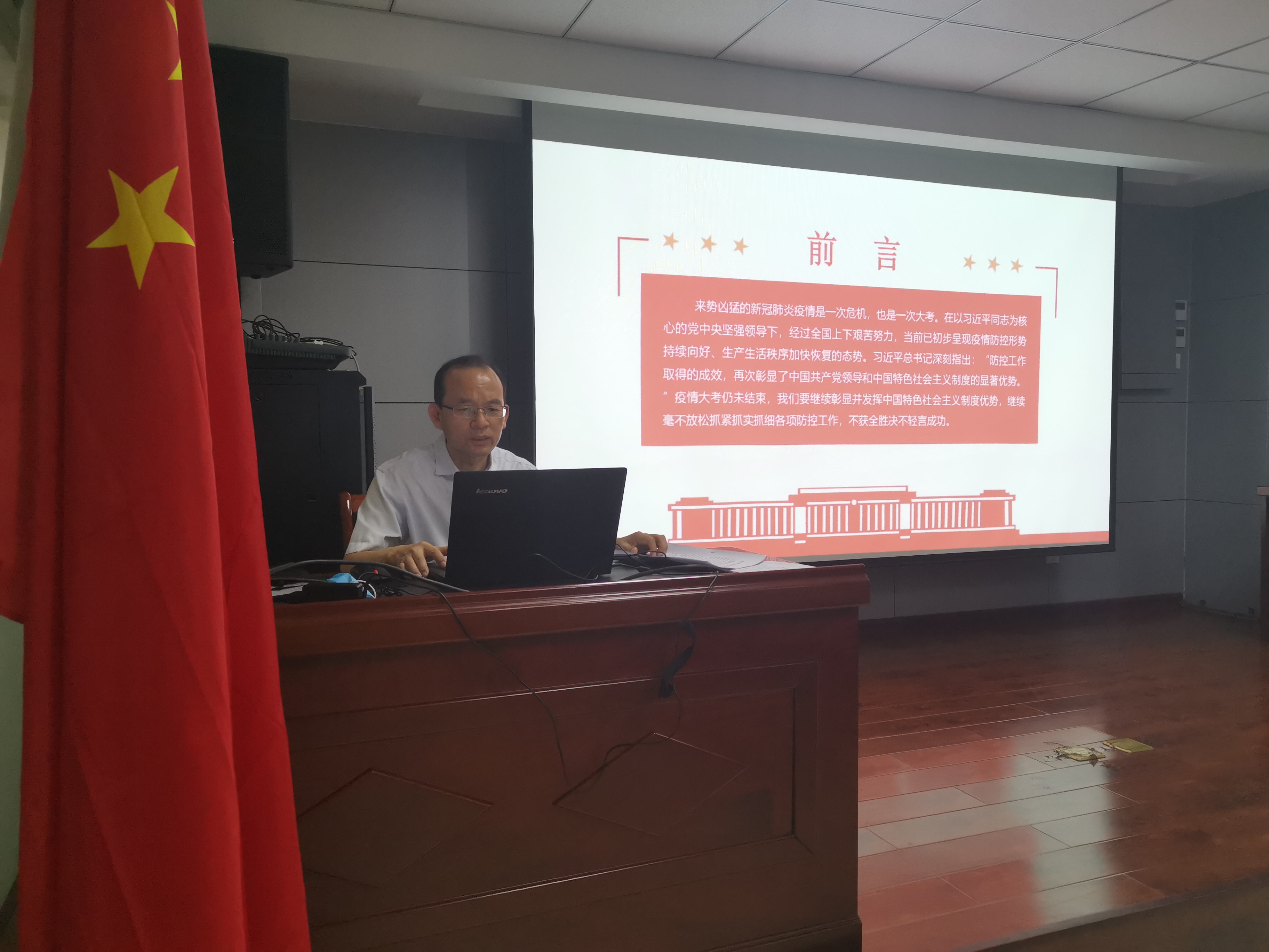 2020年7月2日上午,中共U8平台第二支部委员会支部书记焦俊良同志以“在大考中彰显中国特色社会主义制度优势”为题,为全体支部党员和入党积极分子上了一堂别开生面的党课。