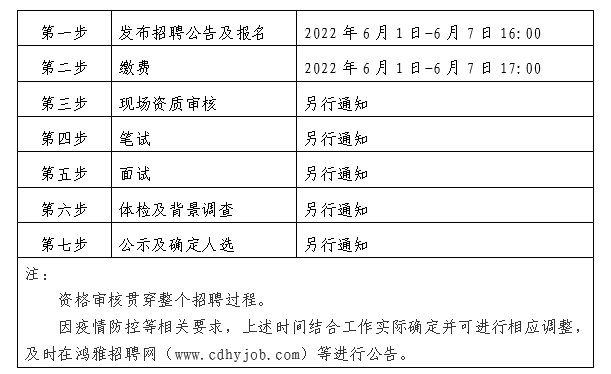 2022年6月1日至2022年6月7日16:00 在鸿雅招聘网(http://www.cdhyjob.com/)、鸿雅微信公众号、U8平台官方网站(/)及上级部门要求的相关网站等发布招聘公告。
